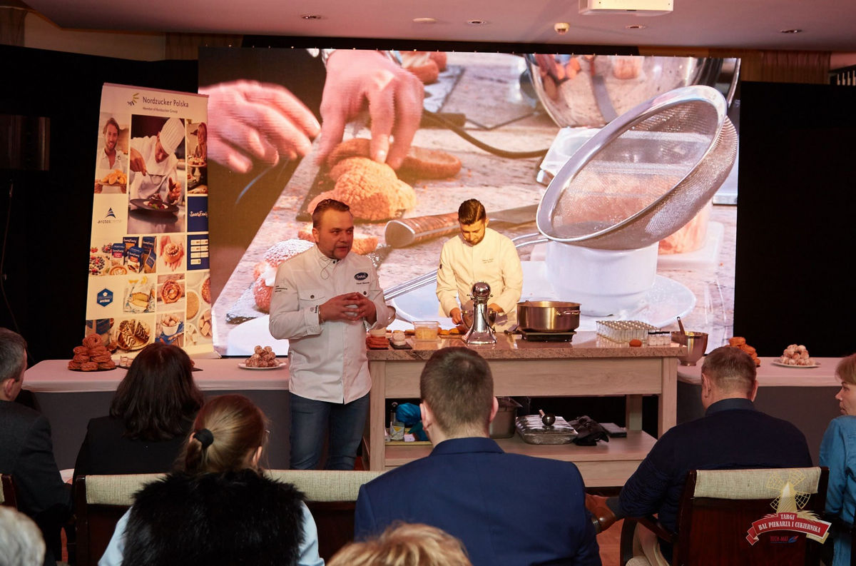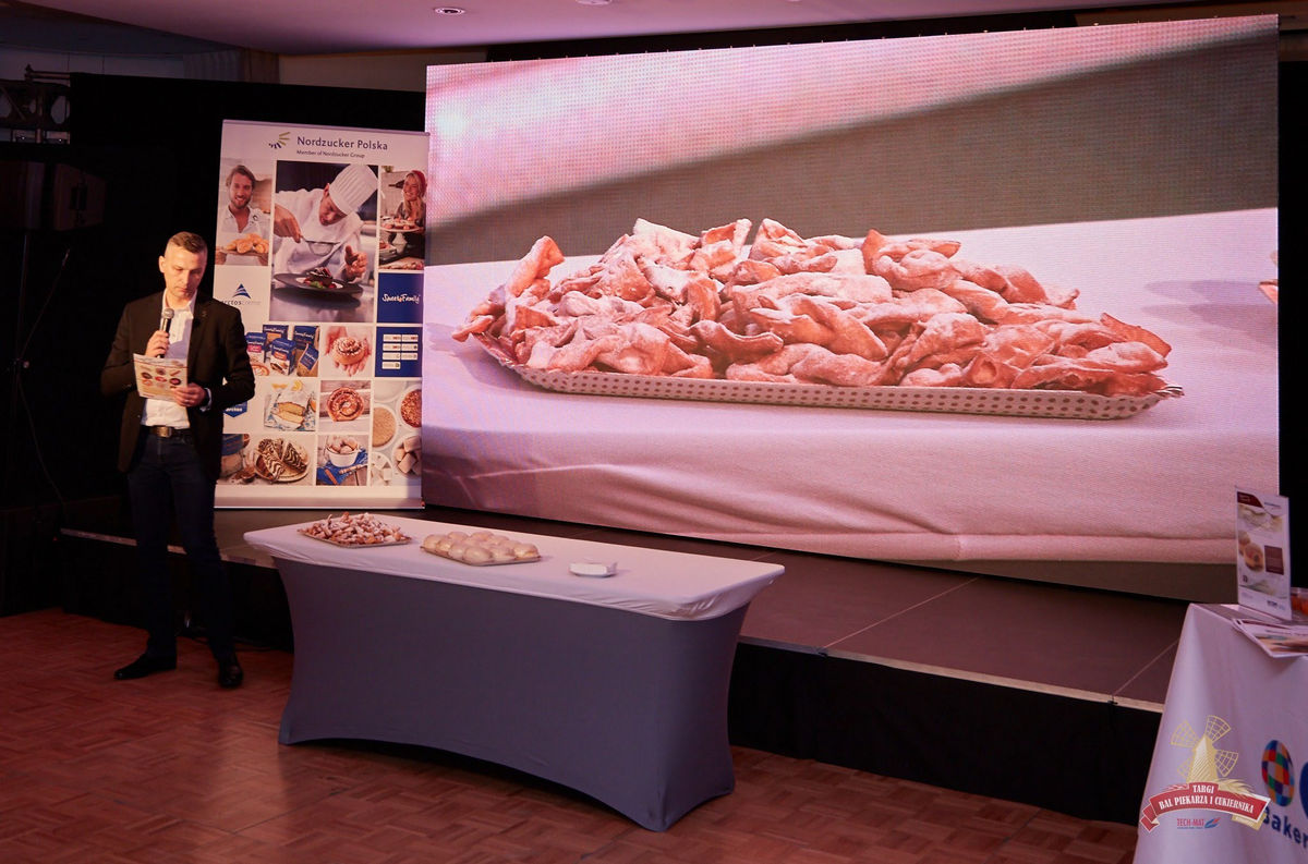 Integralną częścią targów była także specjalnie na ten cel zaaranżowana przestrzeń do prezentacji poszczególnych wystawców. W tym przypadku postawiliśmy na profesjonalną scenotechnikę z ekranem złożonym z paneli diodowych P3 o wymiarach 4,5 na 2,5 metra, estradowym nagłośnieniem JBL i oświetleniem. Do tego strefę pokazów wyposażyliśmy w dwie kamery, które na żywo relacjonowały prezentację na monitorach rozstawionych w hotelu. W tej samej przestrzeni zorganizowaliśmy Festiwal Pączka i Faworka, w ramach którego odbyła się konferencja z prezentacjami szkoleniowymi dedykowanymi produktom i asortymentowi wykorzystywanemu rzez piekarzy i cukierników przed tłustym czwartkiem.