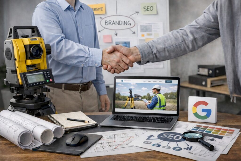 Pracowaliśmy z firmą z branży geodezyjnej, działającą lokalnie, ale z ugruntowaną pozycją i wieloletnim doświadczeniem. Fundament biznesowy był stabilny – oparty na kompetencjach, jakości usług i wypracowanej przez lata renomie. Decyzja o współpracy była naturalnym krokiem w rozwoju firmy. Klient sam zauważył, że przy sprawnie funkcjonującym biznesie pojawia się przestrzeń na coś więcej niż bieżąca operacyjność: uporządkowanie komunikacji, ujednolicenie wizerunku i lepsze wykorzystanie potencjału, który już istnieje.
