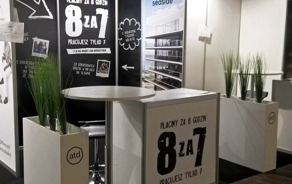 Przykładem naszej udanej aranżacji stoiska targowego jest projekt realizowany dla firmy hotelAG, kiedy zostaliśmy poproszeni o aranżację gotowej zabudowy stoiska typu oktanorm na potrzeby warszawskich targów pracy. Oktanorm to obecnie najbardziej powszechny w kraju system zabudowy, który – niestety – nie daje większych możliwości aranżacyjnych.