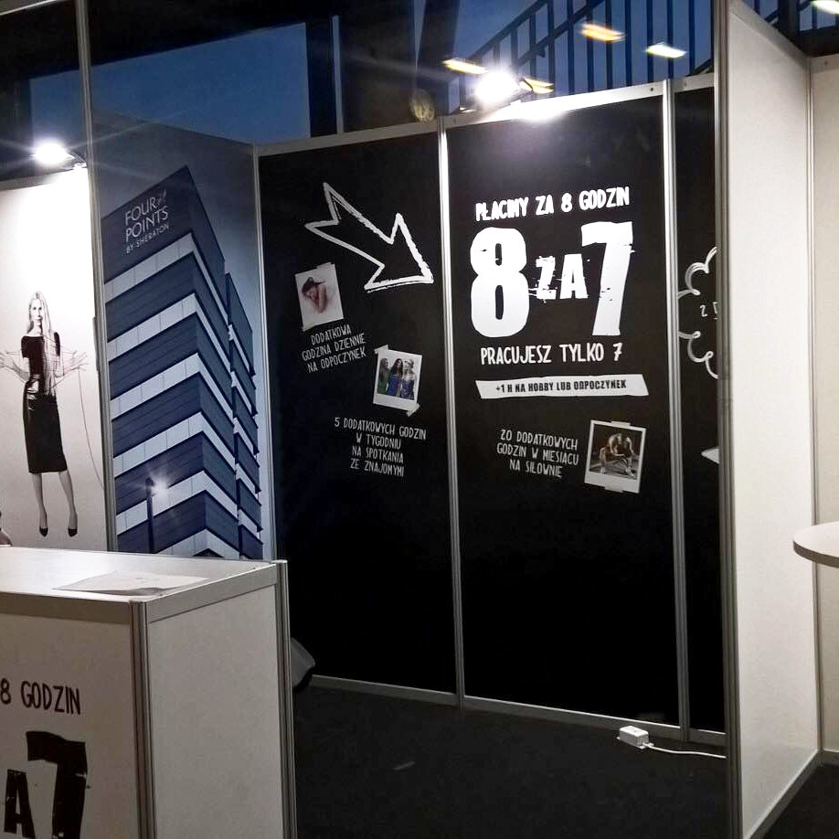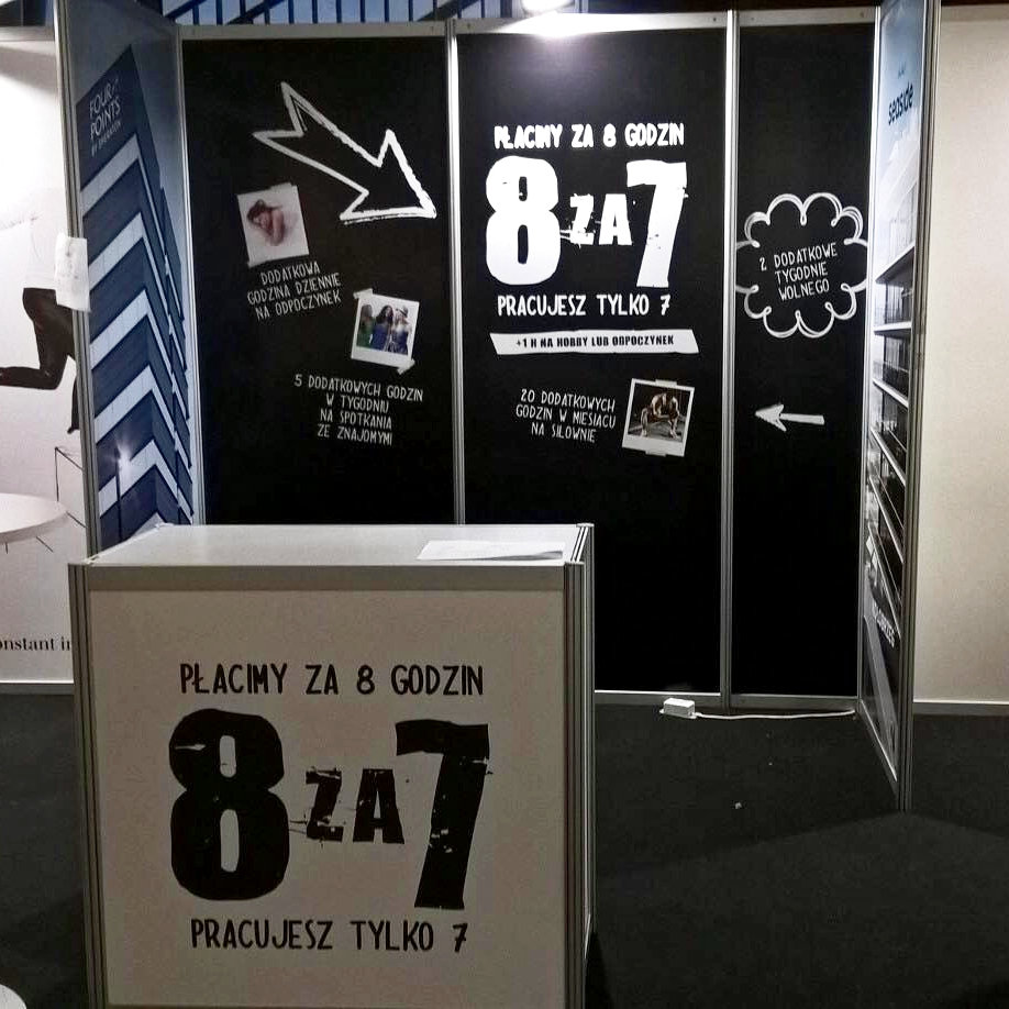 Już po realizacji tego zadania klient wysoko ocenił nasze prace graficzne, które w równym stopniu niosły zamierzany przekaz (opracowany specjalnie na targi pracy), jak i zmieniały nudną zabudowę typu oktanorm w wyrazistą i wygodną przestrzeń skrojoną na potrzeby klienta i jego gości.