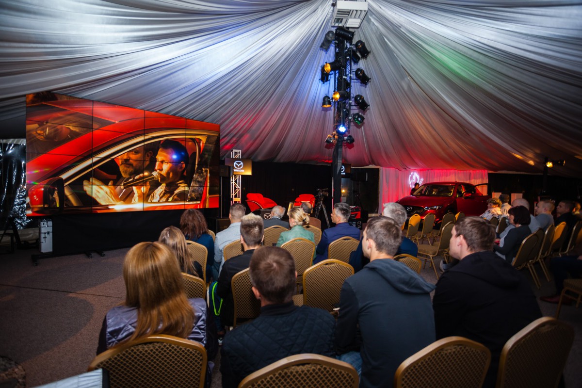 W przypadku tej drugiej części dużą uwagę poświęciliśmy technicznym aspektom organizacji eventu. Zadbaliśmy więc o dużą, 12-metrową multimedialną ściankę bezszwową, nagłośnienie, sugestywne oświetlenie całego wnętrza i dwóch samochodów. Jeden z nich – nową Mazdę CX-5 – postawiliśmy nawet na specjalnej obrotnicy, co dodatkowo uatrakcyjniło całą przestrzeń.
